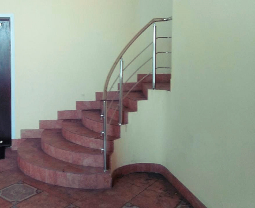 Ограждения с двумя ригелями обеспечивают оптимальную безопасность при подъеме и спуске, сохраняя при этом лёгкость и аккуратный внешний вид. Все элементы изготавливаются из качественной нержавеющей стали марки AISI 304 или 201, что обеспечивает стабильную геометрию и привлекательный блеск поверхности на долгие годы.