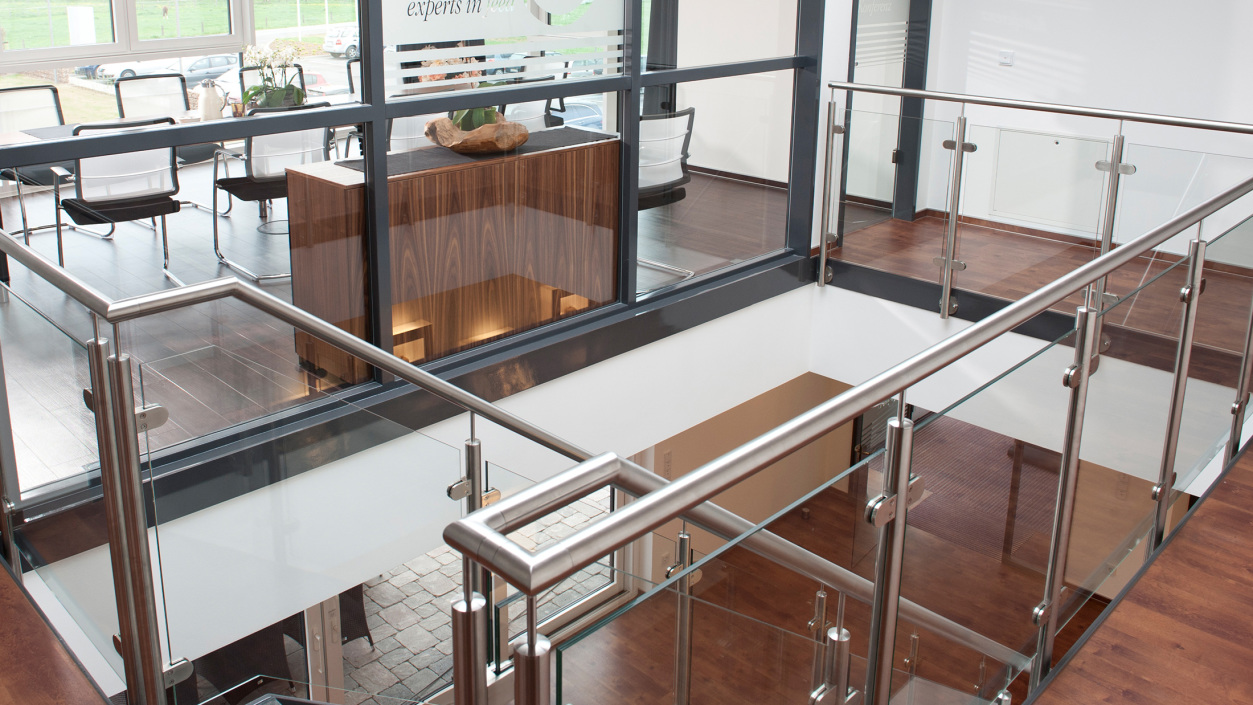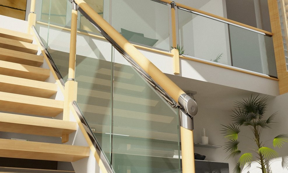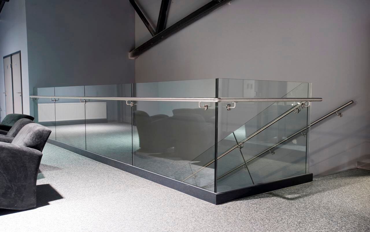 В качестве заполнения ограждений, популярным является стекло со стойкой. Данный вариант применяется внутри помещений, в частных домах, офисах, для создания уникального интерьера. В данном варианте, стойки фиксируются вертикально методом алмазного бурения непосредственно в бетонную основу. Поручни ограждений крепятся сваркой. Между стойками устанавливается стекло и зажимается стеклодержателями.
