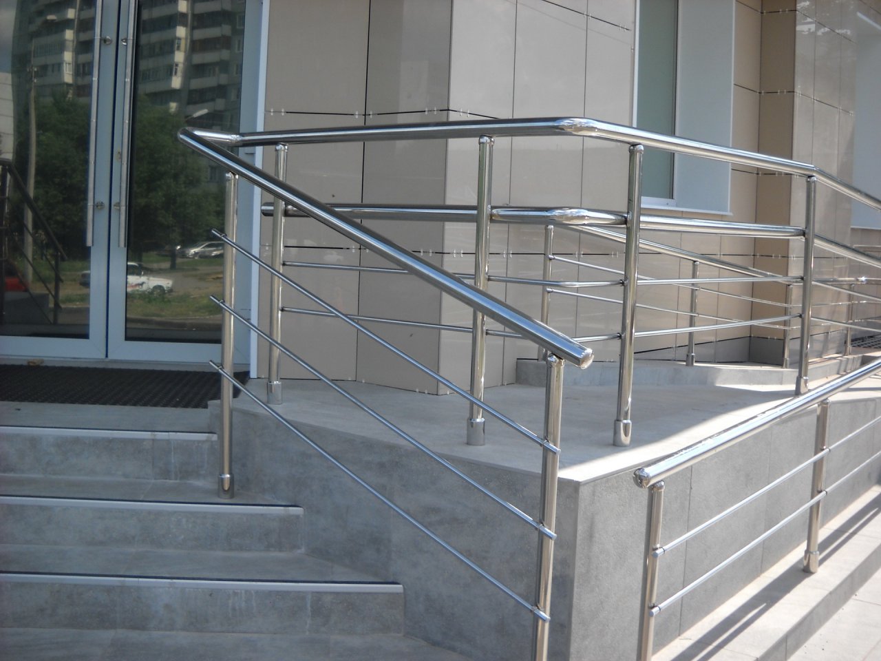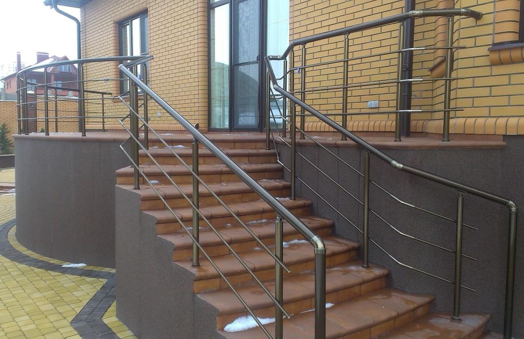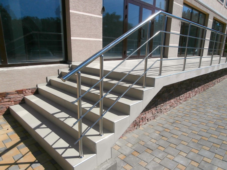 Полированная поверхность стали безупречно сочетается с изделиями из других материалов, что делает возможным оформление крыльца в любом стиле. Например, перила из стали могут быть установлены как на лестницы из мрамора, так и из бетона.