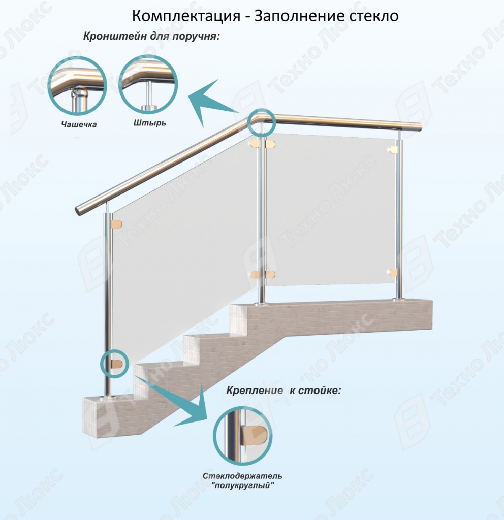 - верхний поручень из нержавеющей с сечением в виде круга (диаметр 50 мм);