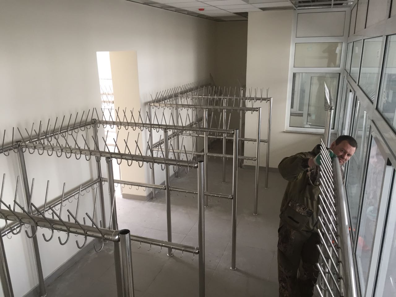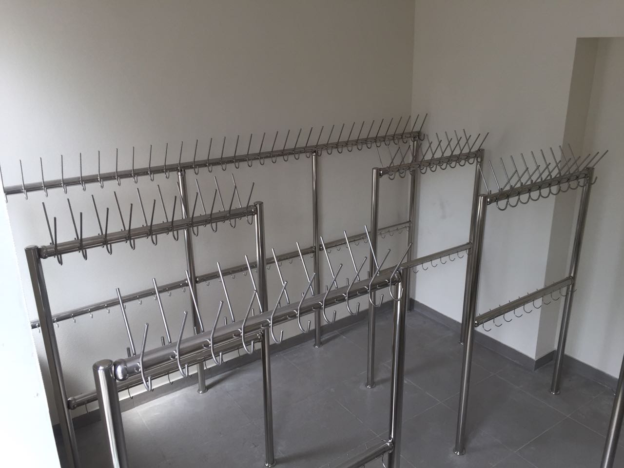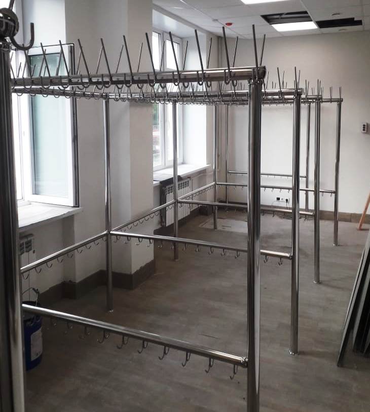 Материал вертикальных и горизонтальных элементов – труба из нержавеющей стали диаметром 50,8 м с толщиной стенки 1,5мм. Труба полированная «зеркальная». Секция вешалок оборудована двумя рядами (верхний и нижний) крючков. Крючки, расположенные в верхнем ряду позволяют разместить головной убор и предмет верхней одежды. Крючки, расположенные в нижнем ряду, позволяют разместить сумку с обувью. Материал крючков – гладкий прут из нержавеющей стали диаметром верх 8мм., низ - 5 мм.