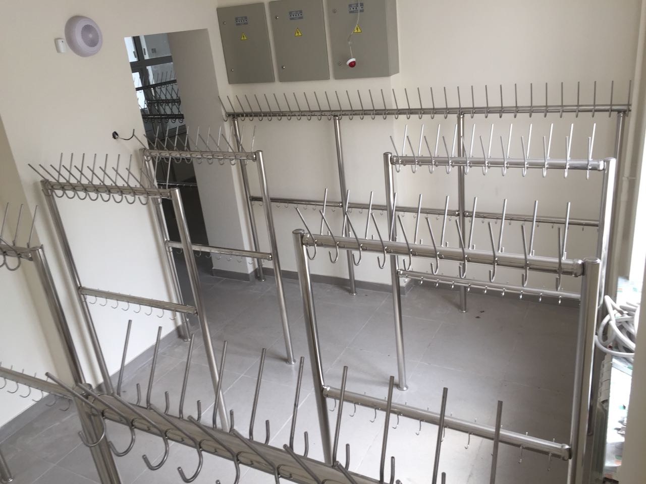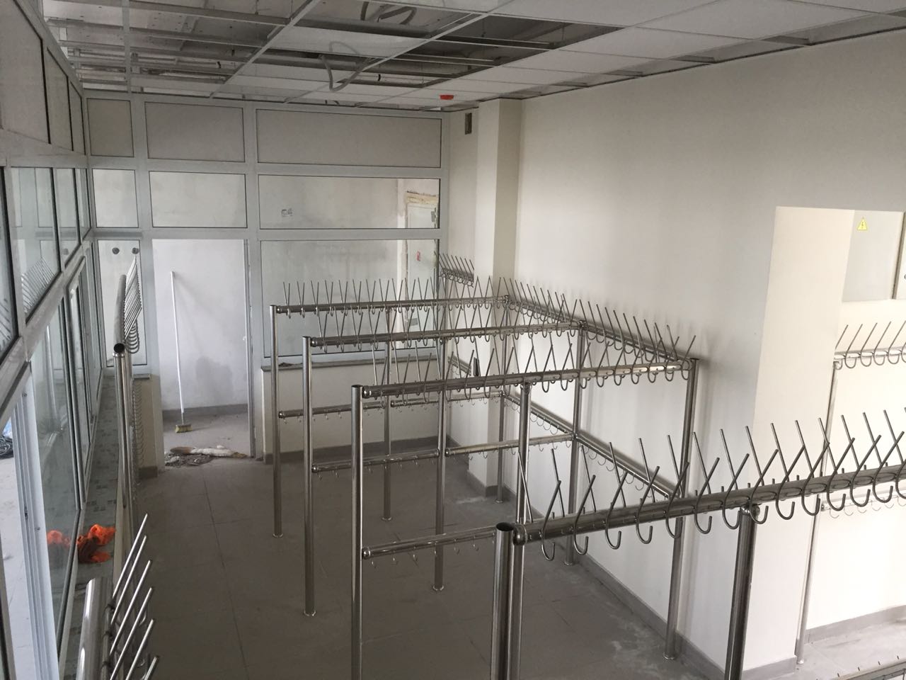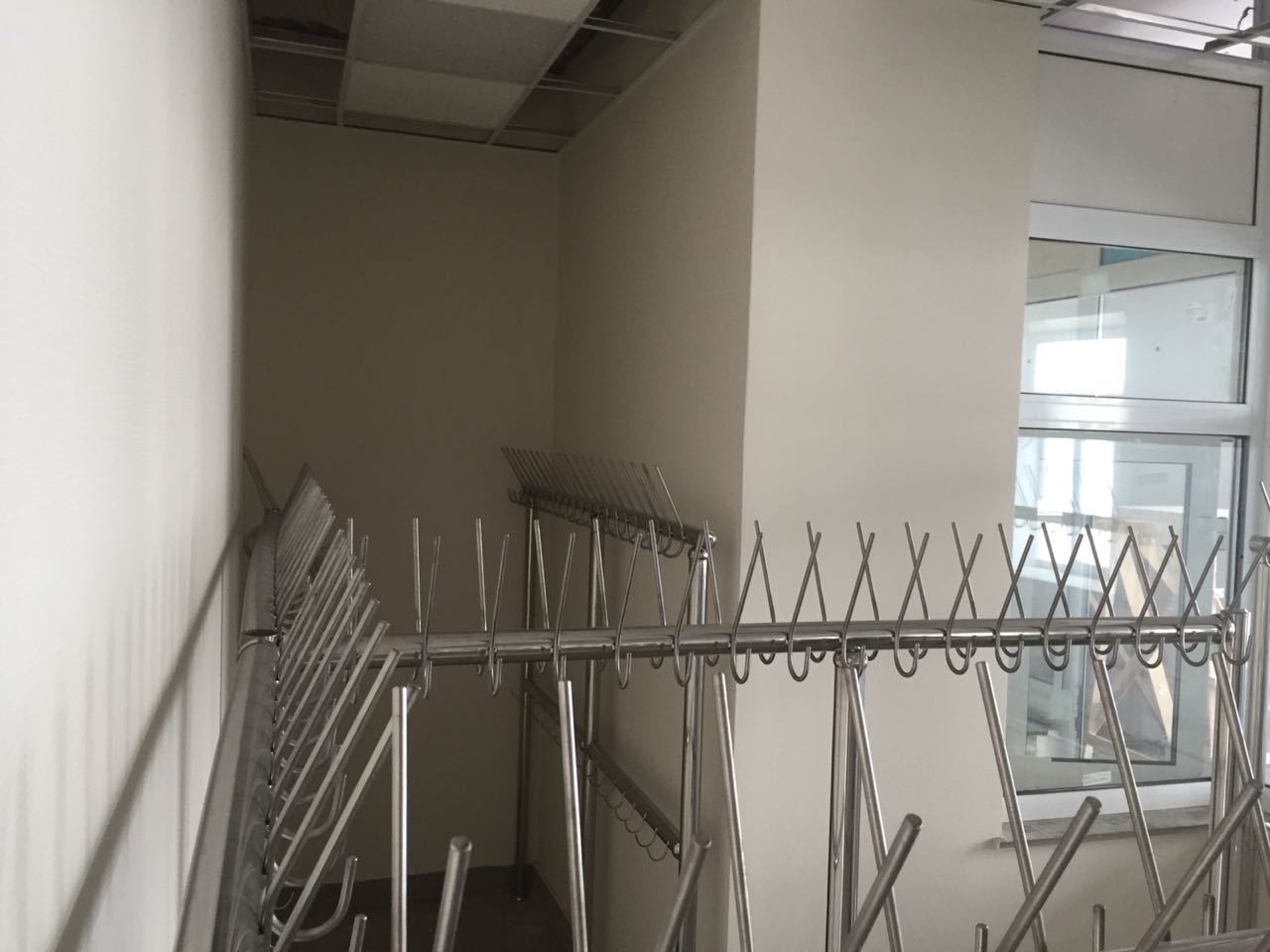 Материал вертикальных и горизонтальных элементов – труба из нержавеющей стали диаметром 50,8 м с толщиной стенки 1,5мм. Труба полированная «зеркальная». Секция вешалок оборудована двумя рядами (верхний и нижний) крючков. Крючки, расположенные в верхнем ряду позволяют разместить головной убор и предмет верхней одежды. Крючки, расположенные в нижнем ряду, позволяют разместить сумку с обувью. Материал крючков – гладкий прут из нержавеющей стали диаметром верх 8мм., низ - 5 мм.