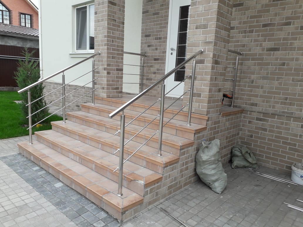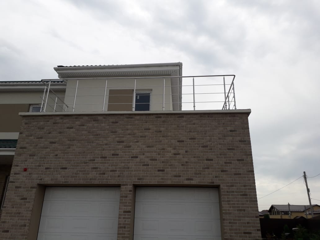 Изготовление и монтаж ограждений крылец и балкона для частного дома в г. Арамиле. Ограждения выполнены с использованием декоративной фурнитуры.